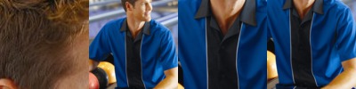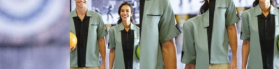 Solid black notched self-collar, back and side panels add definition to a classic bowling shirt.