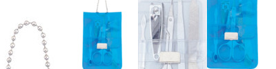 - 5 Piece manicure set packed in a slim translucent vinyl case with snap-closure and a convenient bead chain